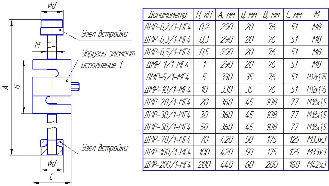 Динамометр растяжения ДМР-МГ4 состоит из электронного блока, датчика силы и силовводящих элементов на растяжение (узлов встройки), которые являются универсальными для испытательных и разрывных машин. По спец. заказу возможно изготовление индивидуальных силовводящих элементов.