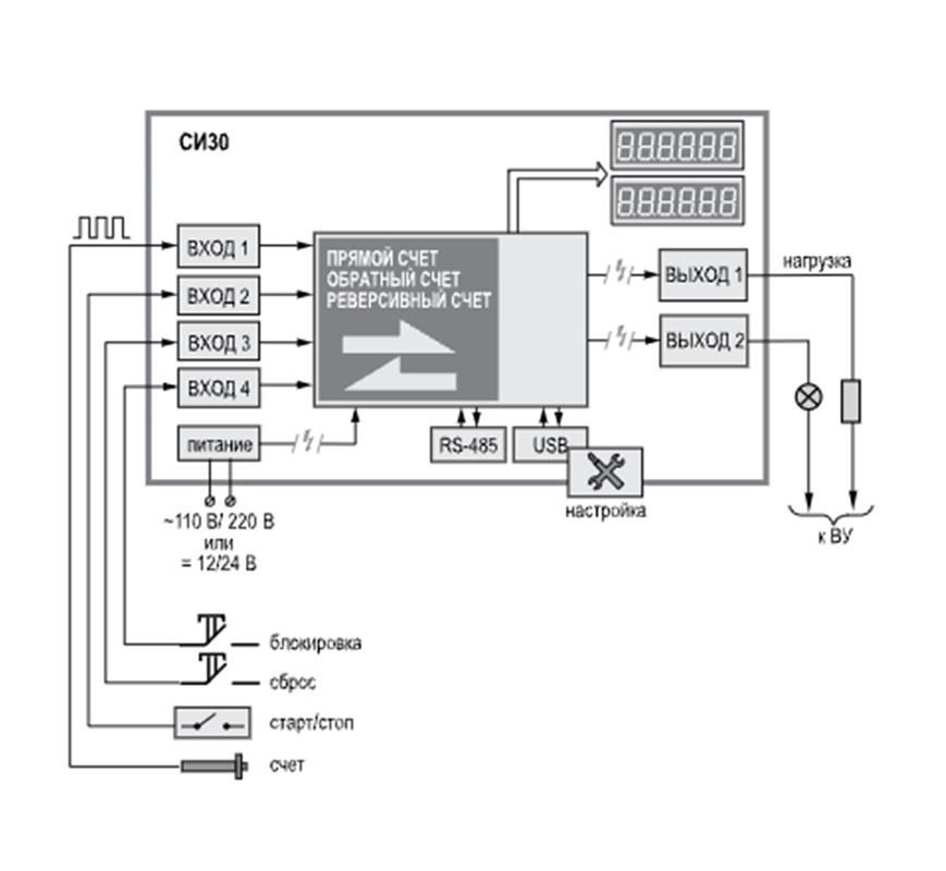 - Прямой, обратный или реверсивный счет импульсов, поступающих от подключенных к прибору датчиков.