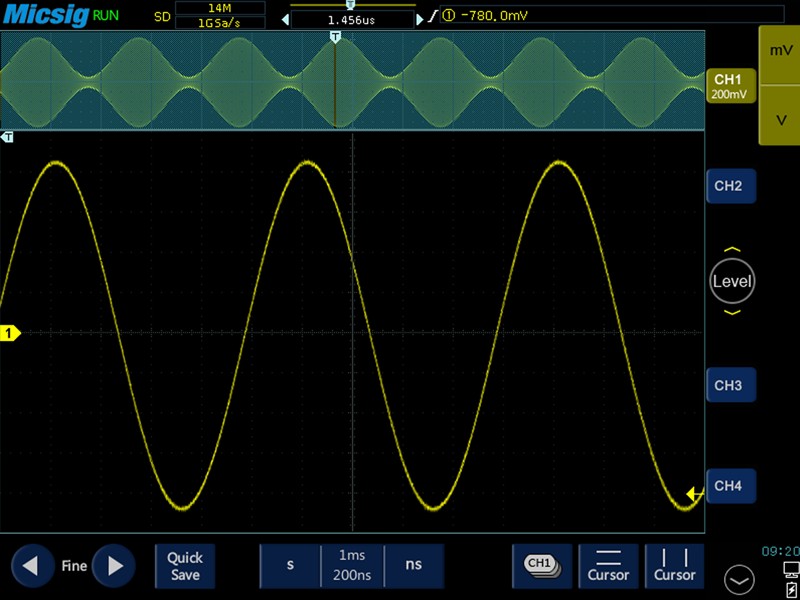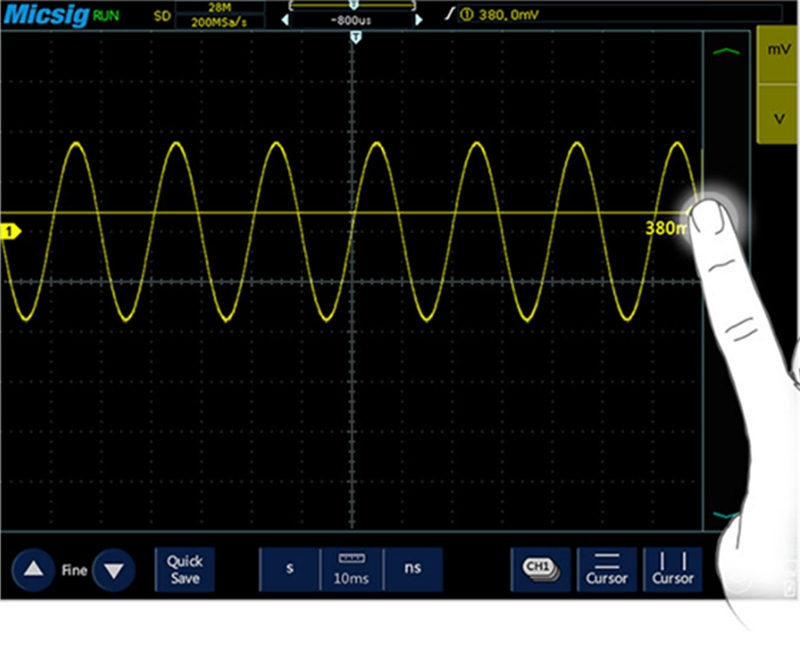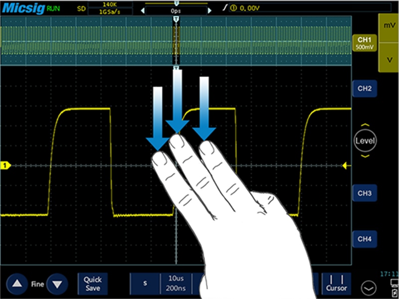 Дважды щелкните пальцем по экрану осциллографа Micsig в нужном месте для снижения коэффициента развертки.