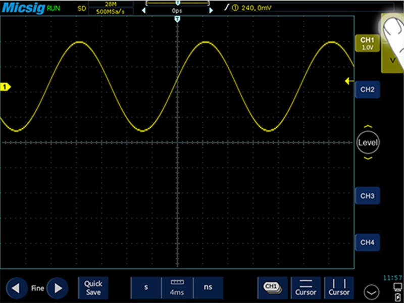 Быстро проведите вниз по экрану осциллографа Micsig одновременно тремя пальцами для доступа к функции растяжки осциллограммы.