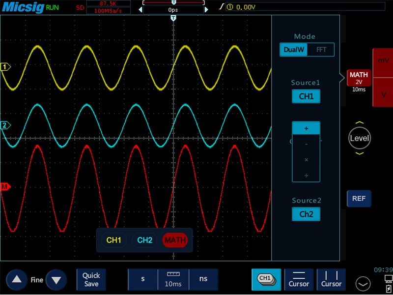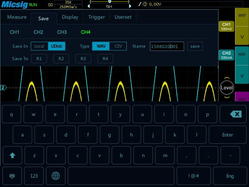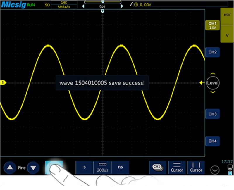 Чтобы сделать моментальный снимок экрана быстро проведите по экрану осциллографа Micsig сверху вниз четырьмя пальцами. Осциллограммы можно просматривать и редактировать непосредственно в осциллографе.
